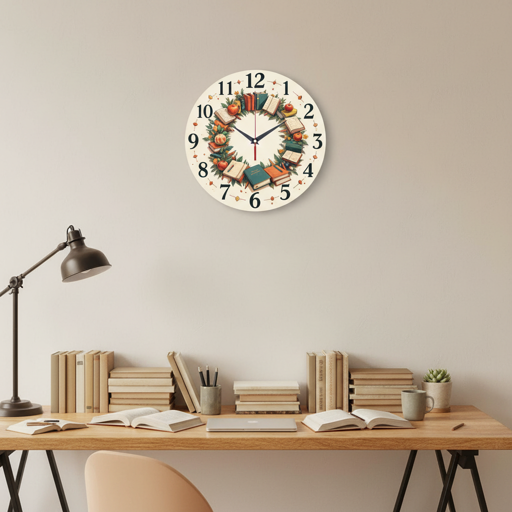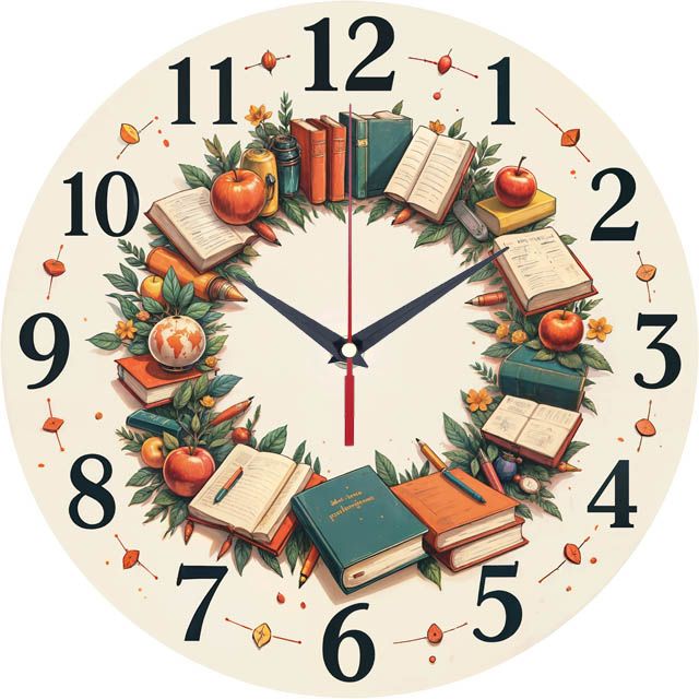«Подарунок вчителю» — теплі, тематичні настінні годинники з вінком з книг, яблук та шкільного приладдя у теплих осінніх, зелених та червоних відтінках. Великі чорні арабські цифри та контрастні темні стрілки чудово читаються. Пасує для кабінету, класної кімнати, бібліотеки чи домашнього офісу та стане чудовим подарунком для вчителя, викладача або вихователя на 1 вересня чи День вчителя. Перейдіть у головну категорію настінних годинників.